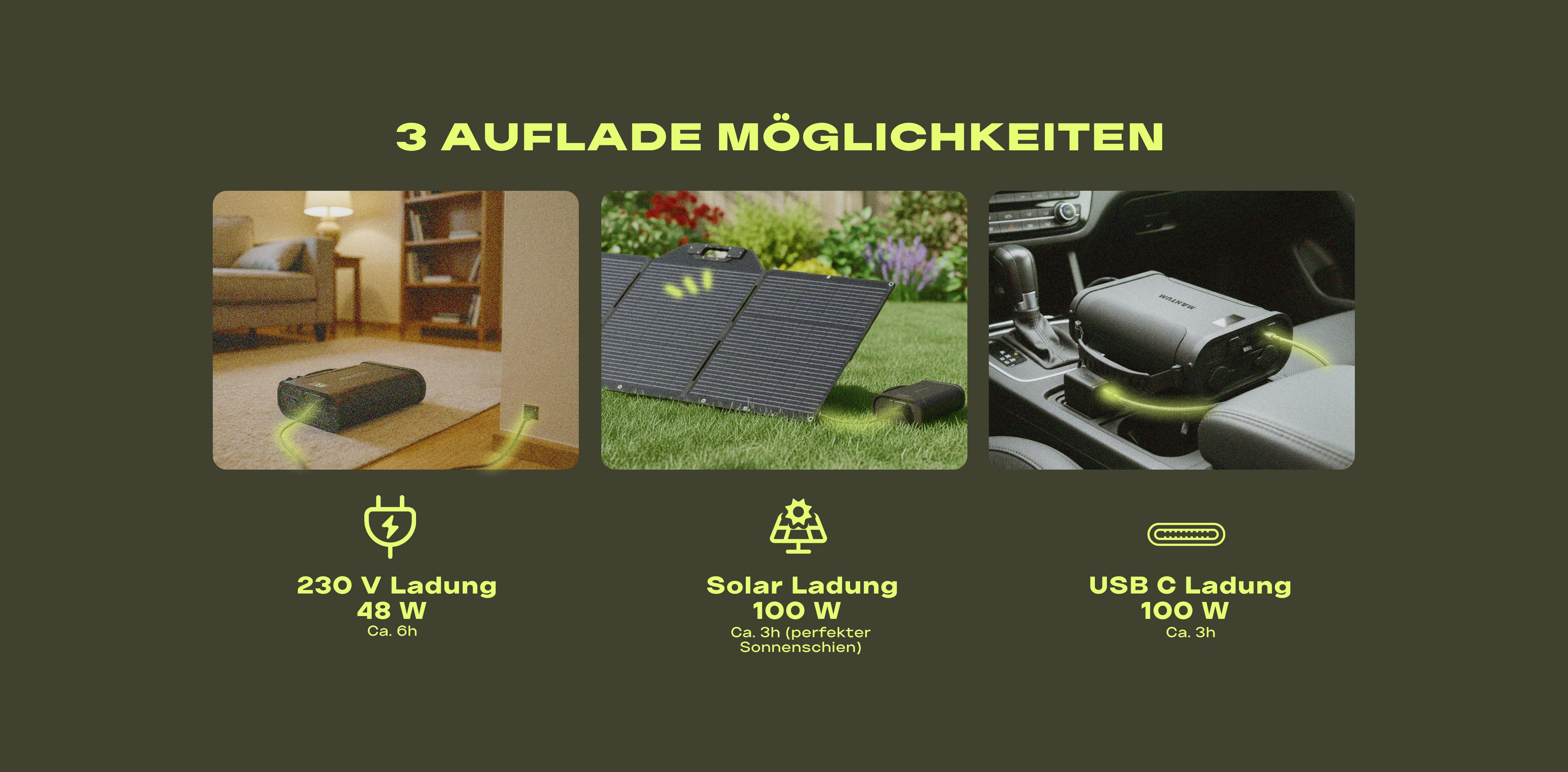 - Mit MPPT 100 W Solar laden (0-100% nur 3h)